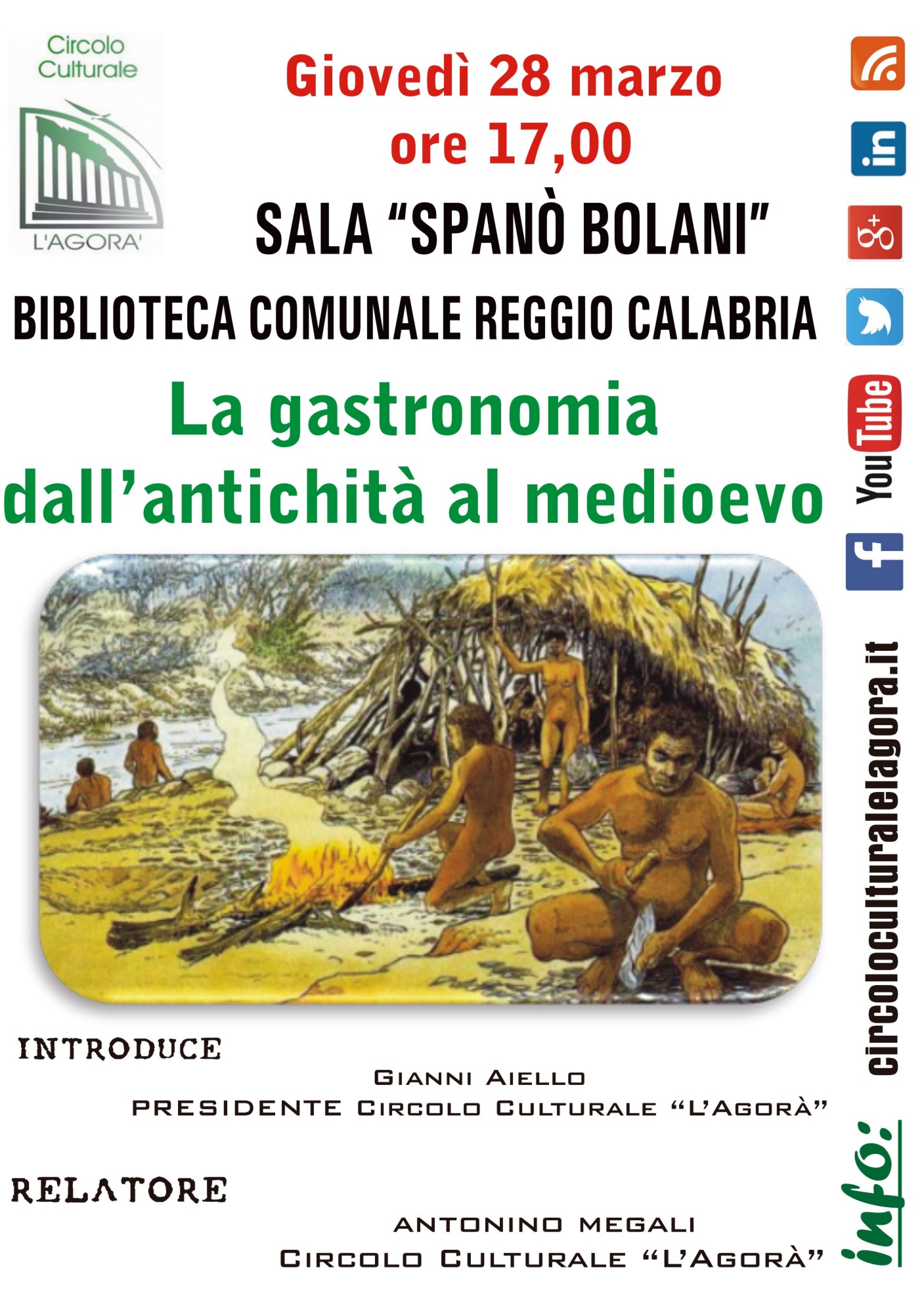Giovedì 28 marzo (ore 17,00) presso la sala „Spanò Bolani” della Biblioteca Comunale „De Nava” di Reggio Calabria, si svolgerà un nuovo incontro, a cura del Circolo Culturale „L'Agorà” avente come tema “La gastronomia dall’antichità al medioevo”. La storia del cibo e della gastronomia in genere è un percorso legato strettamente agli avvenimenti che hanno scandito il comportamento umano nel corso dei secoli. La ricerca del cibo e la lotta per procurarselo hanno spesso determinato la crescita (o la scomparsa) di intere civiltà, dando origine a guerre sanguinose e grandi migrazioni di popoli. Queste alcune delle cifre che saranno oggetto di analisi nell'apposita conversazione culturale alla quale parteciperà in qualità di relatore Antonino Megali (socio del sodalizio organizzatore).
