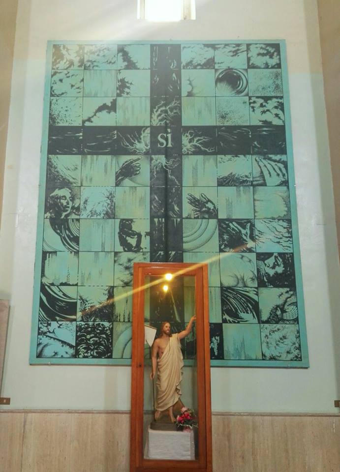 Ricordo che entrando in chiesa il primo gesto era intingere la mano nell’acquasantiera, e fare il segno della croce, rituale irrinunciabile, obbligato, gesto impartito con devozione dalle nostre mamme.Vi condurrò a conoscere un’altra opera d’arte custodita nella chiesa San Giuseppe di Piano Casa di Catanzaro; un’opera della nostra era contemporanea di notevole spessore artistico e teologico.