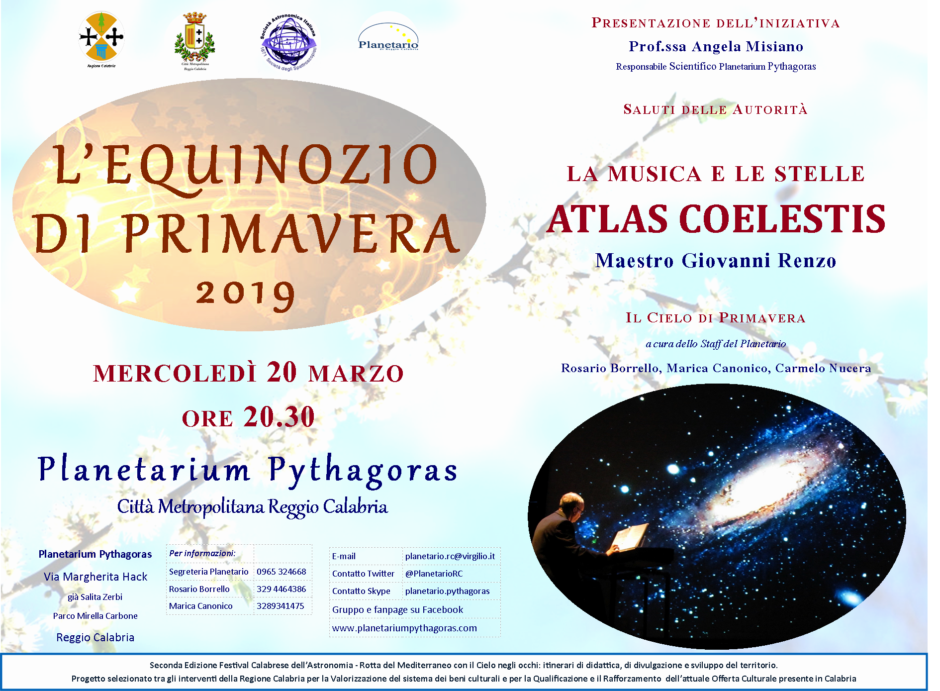 La cittadinanza tutta è invitata, mercoledì 20 marzo ore 20.30, al concerto per pianoforte, computer e video con animazioni ed immagini legate agli eventi astronomici: “Atlas Coelestis: la musica e le stelle”.