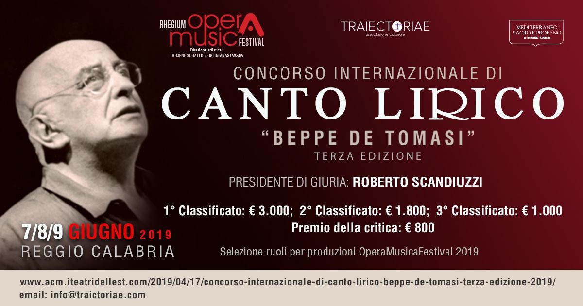 All’interno del Rhegium Opera Musica Festival si propone nei giorni 7, 8 e 9 giugno, la terza edizione del Concorso Internazionale di Canto Lirico “Beppe De Tomasi”, in onore del regista teatrale e attore teatrale italiano, spentosi il 4 giugno del 2016. Si tratta di un concorso che, negli anni precedenti, ha visto una giuria prestigiosa assegnare premi significativi e ha permesso ai vincitori e ai segnalati di partecipare come protagonisti alle produzioni del Rhegium Opera Festival e di altri teatri.