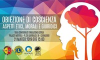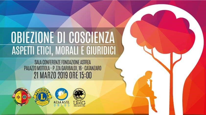 Gli aspetti etici, morali e giuridici dell'obiezione di coscienza verranno affrontanti in un importante convegno, promosso e organizzato dal Club Lions Catanzaro Host, in collaborazione con l'associazione ACSA & STE Onlus e l'Università Magna Graecia, che si terrà giovedì 21 marzo, a partire dalle ore 15, nella Sala Conferenze della Fondazione Astrea – Palazzo Mottola in Piazza Garibaldi, 16.