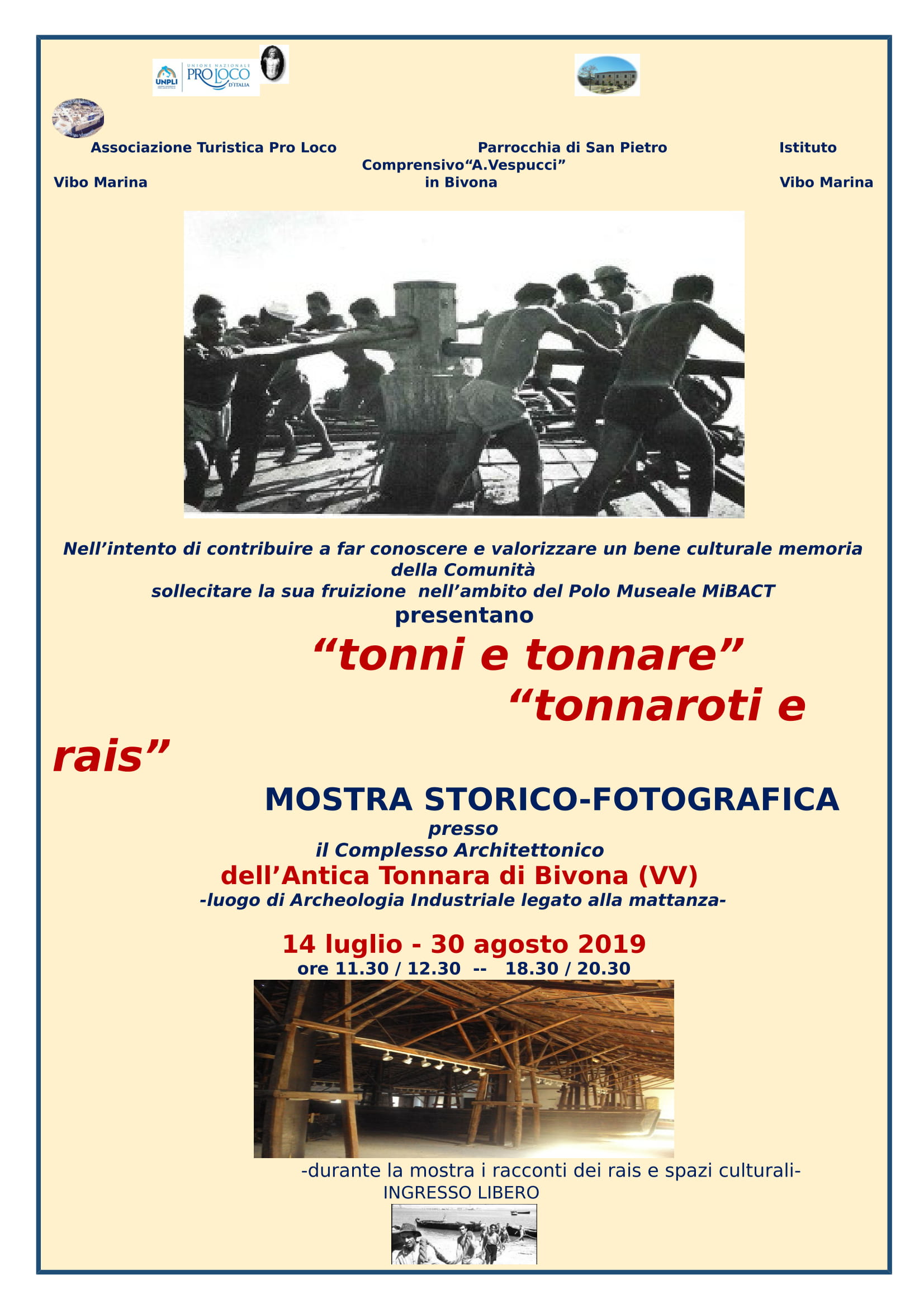 L’iniziativa è organizzata dalla Pro Loco di Vibo Marina, insieme alla Parrocchia di “San Pietro” in Bivona ed all’Istituto comprensivo statale “A. Vespucci” di Vibo Marina che presenta anche un lavoro dei ragazzi proprio sulla Tonnara. Un ringraziamento va ai familiari dei rais ed a quanti amici della Tonnara a vario titolo si adoperano credendo che per tutti, ma soprattutto per la Comunità di Bivona, sia importante in estate poter avere aperto una parte dell’edificio, anche se non si può più attendere di vederlo completamente vivo e fruibile come ogni Museo d’interesse regionale /nazionale , donando al luogo sviluppo e prestigio.