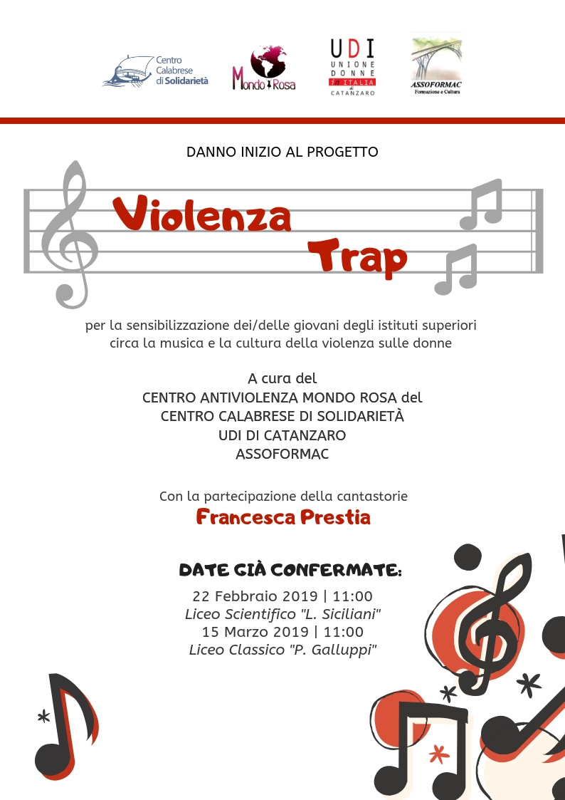 Noi dell’UDI di Catanzaro siamo felici di unirci al Centro Antiviolenza Mondo Rosa del Centro Calabrese di Solidarietà, alla cantastorie Francesca Prestia e all’ASSOFORMAC per iniziare il progetto “Violenza Trap”. L’obiettivo dell’iniziativa è la sensibilizzazione dei/delle giovani in età scolastica circa la cultura della violenza contro le donne che viene promossa dai brani dei nuovi modelli musicali, specialmente del recente stile trap, preoccupante poiché i testi delle sue canzoni non solo incitano alla violenza contro le donne ma le descrivono in maniera svilente ed offensiva. Pertanto si prevede l’ascolto dei testi di giovani trapper, la successiva analisi del testo con i ragazzi e le ragazze coinvolte, utile a sviluppare un pensiero critico così da poter scegliere con maggiore consapevolezza i modelli da seguire. Gli incontri con i giovani saranno condotti da avvocate, psicologhe e assistenti sociali dell’UDI e di Mondo Rosa. La cantastorie Francesca Prestia inoltre proporrà testi da lei scritti dimostrando la possibilità avere modelli positivi di denuncia sociale rispetto a diverse problematiche ma soprattutto circa la violenza contro le donne.