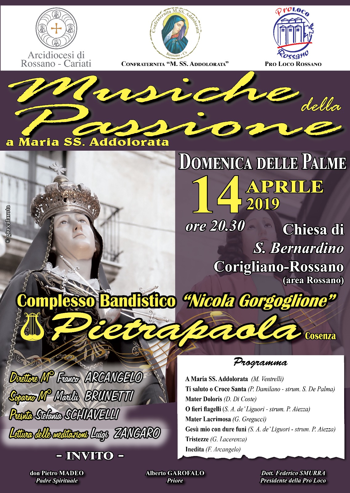 Sarà la suggestiva location della Chiesa di San Bernardino nel centro storico di Rossanoad ospitare il concerto della Passione a Maria SS. Addolorata. L’evento, promosso dall’Arciconfraternita della SS. Addolorata di Rossano con il patrocinio dell’Arcidiocesi di Rossano-Cariati ed il supporto della Pro Loco bizantina, è in programma domenica delle Palme 14 Aprile alle ore 20,30.