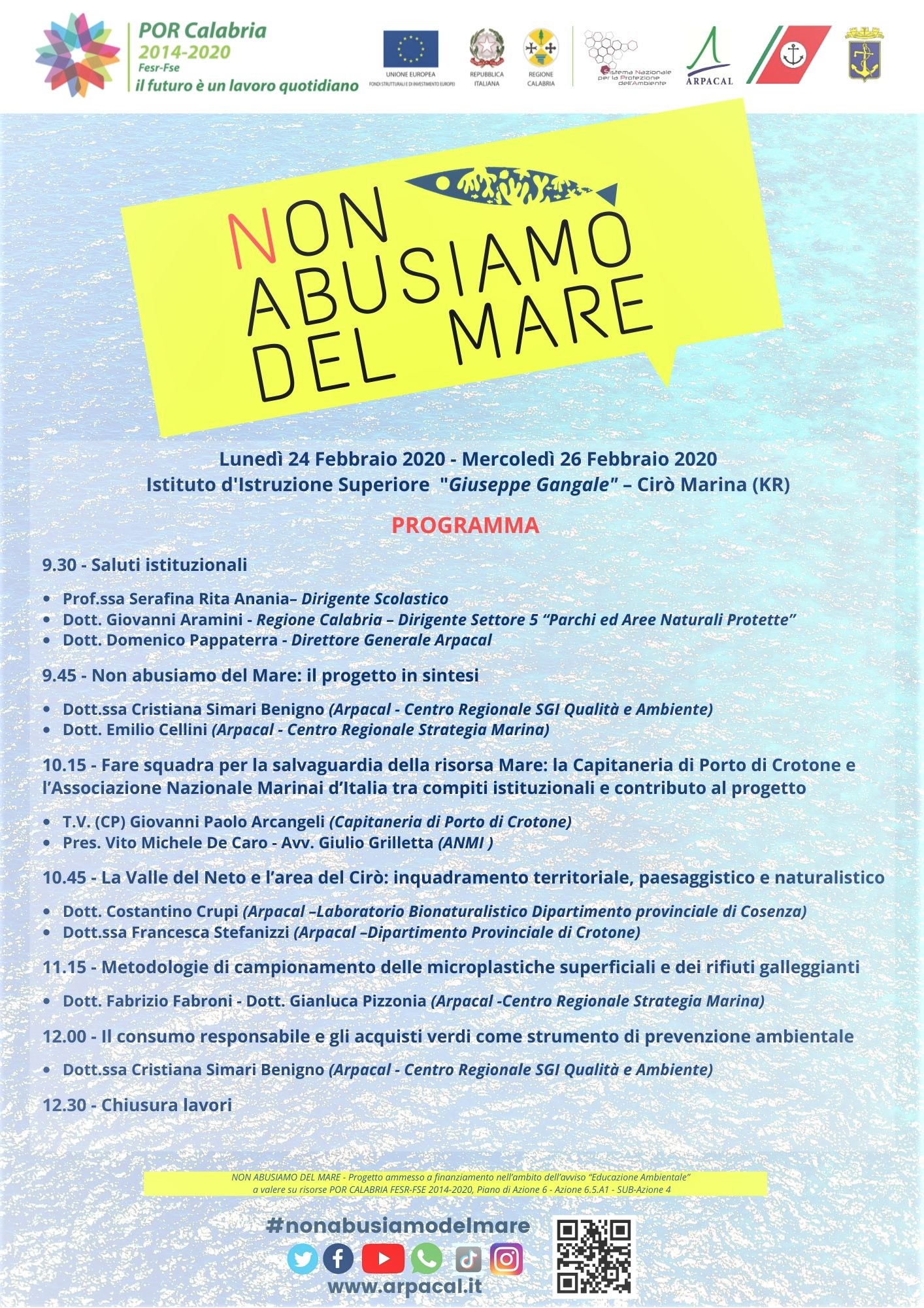 Lunedì 24 e mercoledì 26 febbraio prossimi, a partire dalle ore 9:30, nell’Istituto di istruzione superiore “G. Gangale” di Cirò Marina si terranno la seconda e terza tappa degli eventi lancio del progetto, realizzato da Arpacal con la Capitaneria di Porto di Crotone e con l’Associazione Nazionale Marinai d’Italia (ANMI) – sezione di Crotone.
