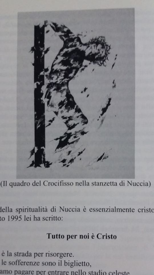 Nella croce si sentiva in intimità con CRISTO. L’opera serigrafica raffigurante “Il Crocifisso di Nuccia” presente in questo articolo è stata realizzata dal maestro Alessandro Mazzitelli di Catanzaro nel 1980.Vorrei concludere con una rincuorante frase di Nuccia: “Sorridete sempre e ricordate che ogni volta che sorridete io sorriderò con voi”. Miracolo di DIO.
