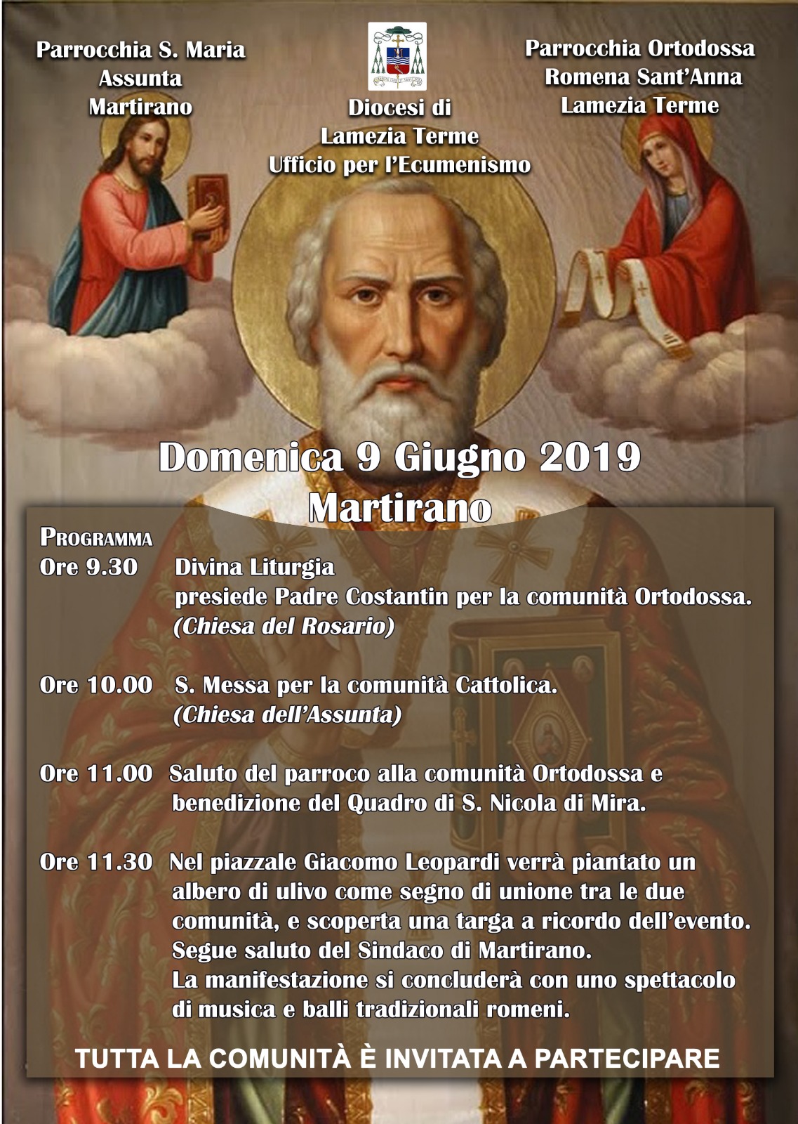MARTIRANO.È in programma per oggi, 9 giugno 2019, la giornata di dialogo interreligioso tra la comunità cattolica e quella ortodossa di origine romena presente nella Diocesi lametina. L’iniziativa è promossa dall’Ufficio diocesano per l’ecumenismo e il dialogo interreligioso diretto da don Antonio Stranges. Stamattina alle 9.30, Padre Costantin Ghimisi presiederà la Divina Liturgia per la comunità ortodossa nella Chiesa del Rosario a Martirano. Alle 10 è prevista la Santa Messa per la comunità cattolica officiata da don Antonio Stranges nellaChiesa dell’Assunta, sempre nel centro montano dell’hinterland lametino. Per le 11 è in programma il saluto alla comunità ortodossa e la benedizione del quadro di San Nicola di Mira. Successivamente nel piazzale Giacomo Leopardi sarà piantato un albero di ulivo “come segno di unione tra le due comunità”. Sarà anche scoperta una targa a ricordo dell’evento che sarà suggellato dal saluto del sindaco di Martirano Francesco Bartolotta. La giornata si concluderà con una festa di musica e balli romeni. L’incontro tra la Parrocchia Santa Maria Assunta di Martirano e la Parrocchia ortodossa romena di Sant’Anna di Lamezia è in piena sintonia col pensiero di Papa Francesco che proprio di recente si è recato in Romania per portare un messaggio di pace e fraternità.