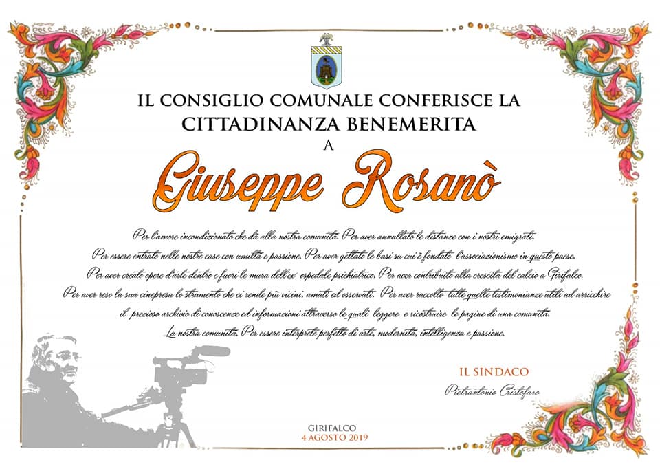 Il Consiglio Comunale ha, invece, omaggiato Pepè Rosanò con un quadro realizzato dal maestro Franco Ferragina. Significativo il testo dell'attestato consegnato dal sindaco Cristofaro al neo cittadino benemerito; in esso sono riportate le ragioni del riconoscimento: "Per l'amore incondizionato che dà alla nostra comunità. Per aver annullato le distanze con i nostri emigrati. Per essere entrato nelle nostre case con umiltà e passione. Per aver gettato le basi su cui è fondato l'associazionismo in questo paese. Per aver creato opere d'arte dentro e fuori le mura dell'ex ospedale psichiatrico. Per aver contribuito alla crescita del calcio a Girifalco. Per aver reso la sua cinepresa lo strumento che ci rende più vicini, amati ed osservati. Per aver raccolto tutte quelle testimonianze utili ad arricchire il prezioso archivio di conoscenze ed informazioni attraverso le quali leggere e ricostruire le pagine di una comunità. La nostra comunità. Per essere interprete perfetto di arte, modernità, intelligenza e passione".