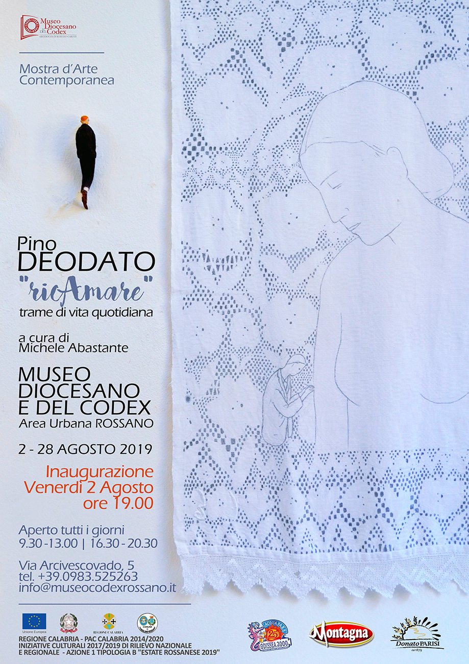 Pino Deodato espone al Museo Diocesano e del Codex, nel comune di Corigliano-Rossano, dal 2 al 28 Agosto con la mostra dal titolo “ricAMARE” trame di vita quotidiana. L’artista calabrese di origine (nato a Nao,Vibo Valentia) ma milanese di adozione, dove vive e lavora, racconta, con un viaggio introspettivo, l’animo umano. Protagoniste, nelle sue opere, sono delle piccole figure di uomini e di donne che scoprono l’amore verso gli altri, l’interesse nei confronti del prossimo, evocando, così, una visione di pace e di ritorno al bene fraterno.