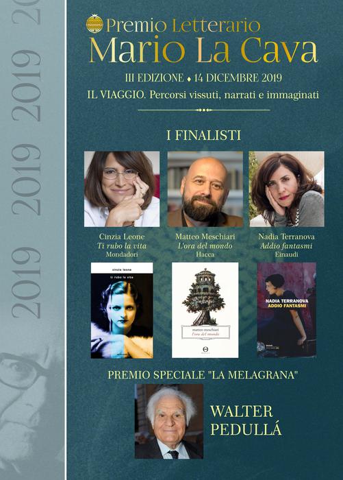 Cinzia Leone con "Ti rubo la vita" (Mondadori), Matteo Meschiari con "L'ora del mondo" (Hacca) e Nadia Terranova con "Addio fantasmi" (Einaudi) sono i finalisti alla terza edizione del Premio Letterario Mario La Cava. Trentasette le opere in concorso al Premio, declinato sul tema "Il viaggio. Percorsi vissuti, narrati e immaginati", organizzato dal Comune di Bovalino in collaborazione con il Caffè letterario "La Cava", con il patrocinio della Regione e il contributo del Consiglio dell'Ordine degli Avvocati di Locri. La giuria tecnica (Andrea Di Consoli, Stefano Ercolino, Marco Gatto, Loredana Lipperini e Vito Teti) dopo la designazione dei finalisti decreterà l'opera vincitrice il 14 dicembre nella cerimonia di premiazione. Premio speciale "La Melagrana" a Walter Pedullà, autore di saggi sulla letteratura italiana e meridionale in particolare. Nella stessa serata il Caffè Letterario La Cava assegnerà un riconoscimento all'opera più votata dai lettori che fanno parte del circolo. (ANSA).