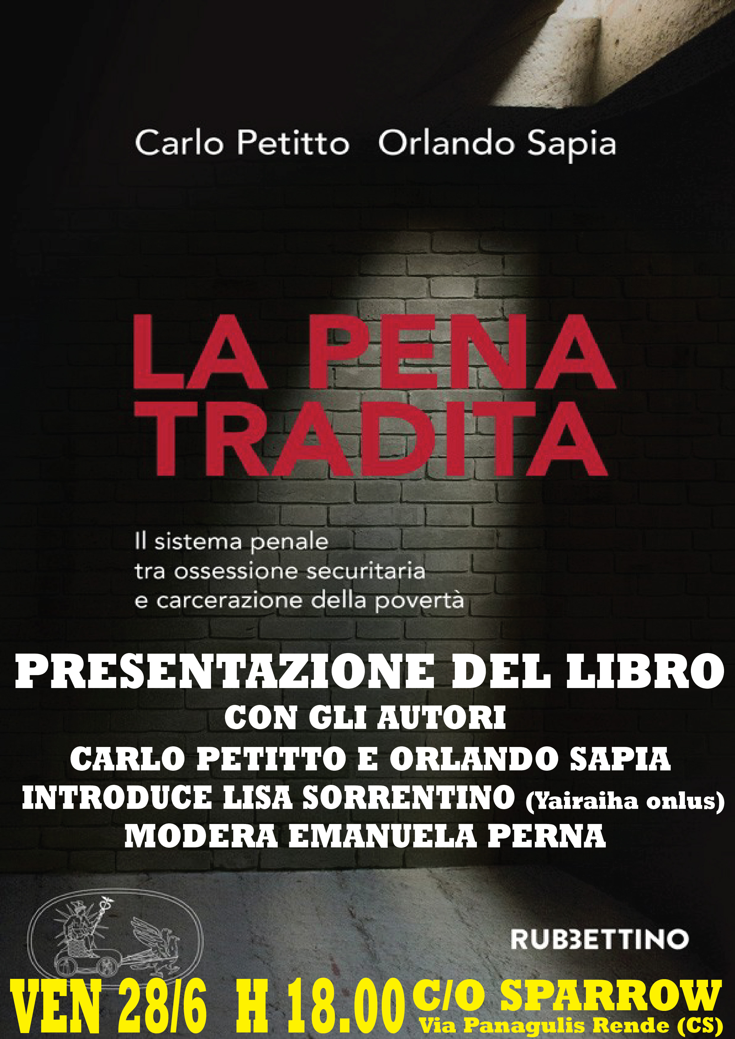 Il 28 giugno a Rende, presso Spazio Precario Autogestito Arrow (Sparrow), sarà presentato il libro “La pena tradita - Il sistema penale tra ossessione securitaria e carcerazione della povertà” (Rubbettino Editore), scritto dagli avvocati catanzaresi Carlo Petitto e Orlando Sapia.