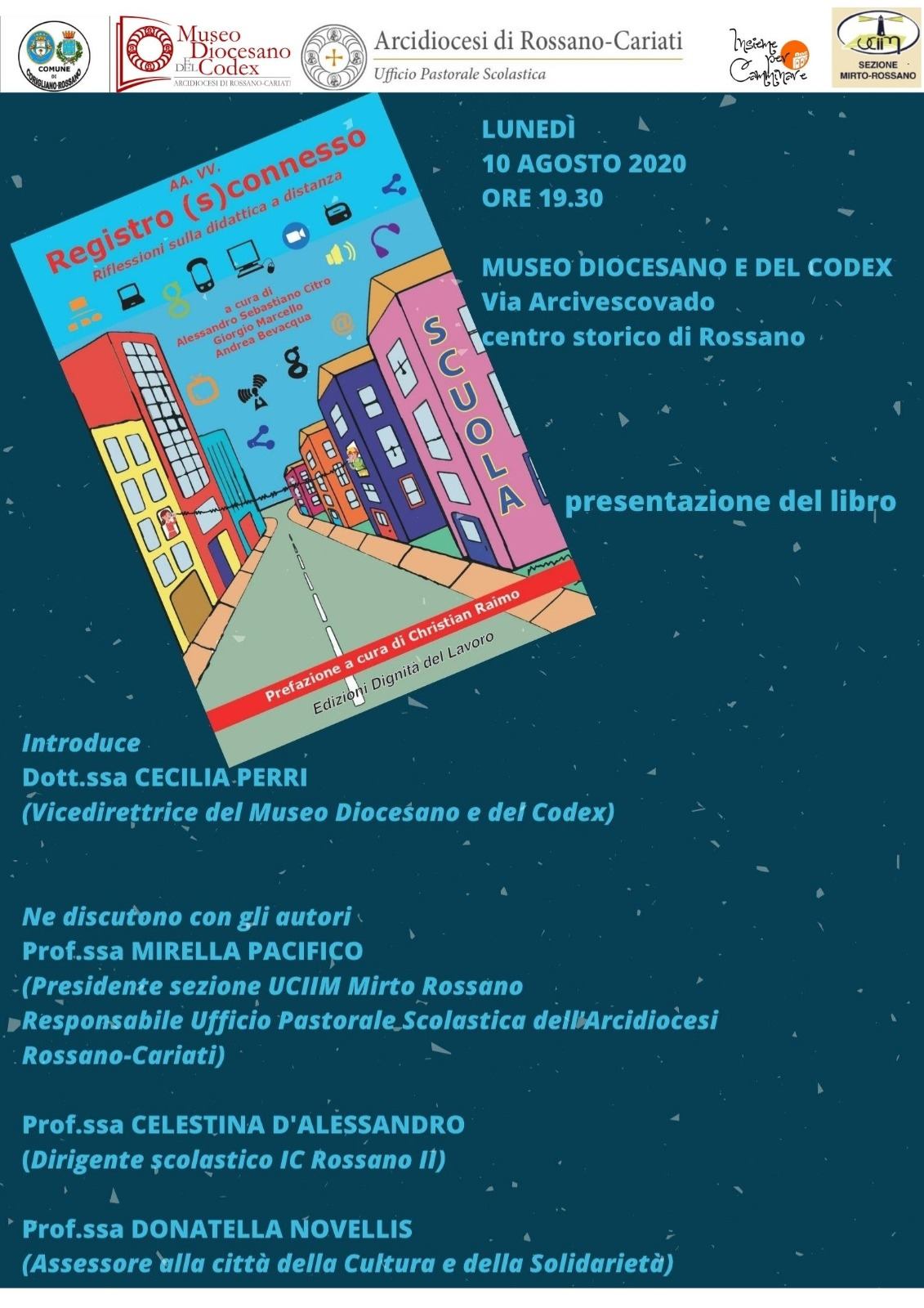 Il dibattito, a cui parteciperanno gli autori del volume, vedrà gli interventi della professoressa Mirella Pacifico, Presidente sezione UCIIM Mirto Rossano e Responsabile Ufficio Pastorale Scolastica dell'Arcidiocesi Rossano-Cariati; della professoressa Celestina D'Alessandro, Dirigente scolastico dell'Istituto Comprensivo Rossano II; della professoressa Donatella Novellis, Assessore alla Città della Cultura e della Solidarietà con delega alla Pubblica Istruzione. Introduce la dottoressa Cecilia Perri, Vicedirettrice del Museo Diocesano e del Codex.