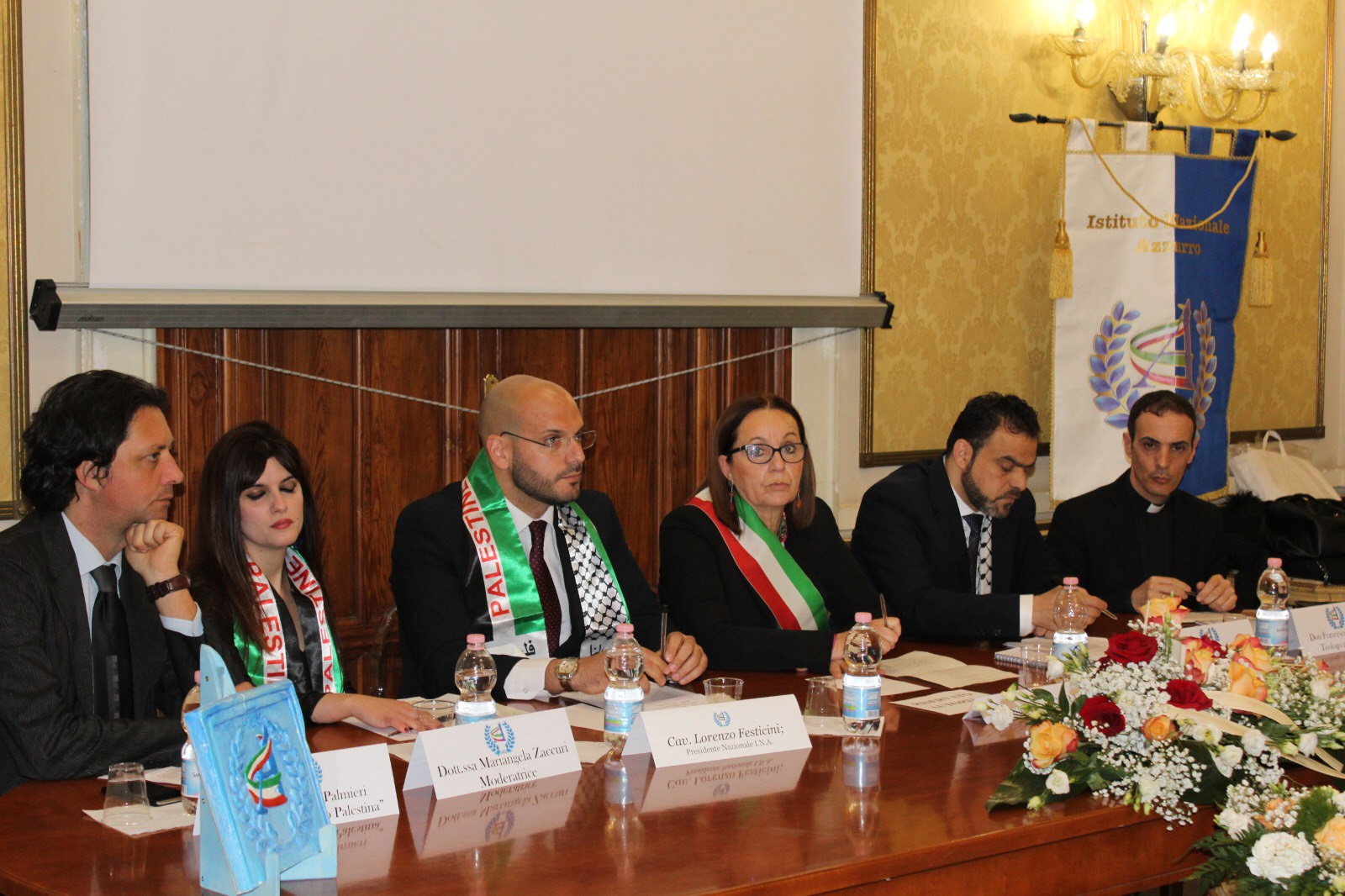Nel tavolo dei relatori hanno portato il loro contributo, il Funzionario dell’Ambasciata di Palestina in Italia con delega alla Cultura il Dott. Odeh Amarneh, il teologo, scrittore e amato presentatore tv Don Francesco Cristofaro, l’Assessore all’Istruzione del Comune di Reggio Calabria Dott.ssa Anna Nucera, il Presidente e Fondatore dell’Istituto Nazionale Azzurro, Cav. Lorenzo Festicini e Il Dott. Federico Palmieri, autore del reportage “Obiettivo Palestina”.