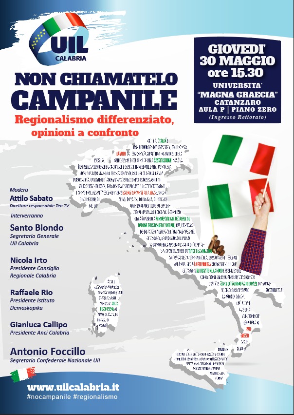 “Non chiamatelo campanile. Regionalismo differenziato, opinioni a confronto”. Sarà questa la traccia portante dell’incontro promosso dalla Segreteria regionale della Uil Calabria che si terrà giovedì 30 maggio, a partire dalle ore 15.30, presso l’Aula P dell’Università della Magna Grecia di Catanzaro (posta al piano zero proprio sopra l’ingresso del Rettorato).