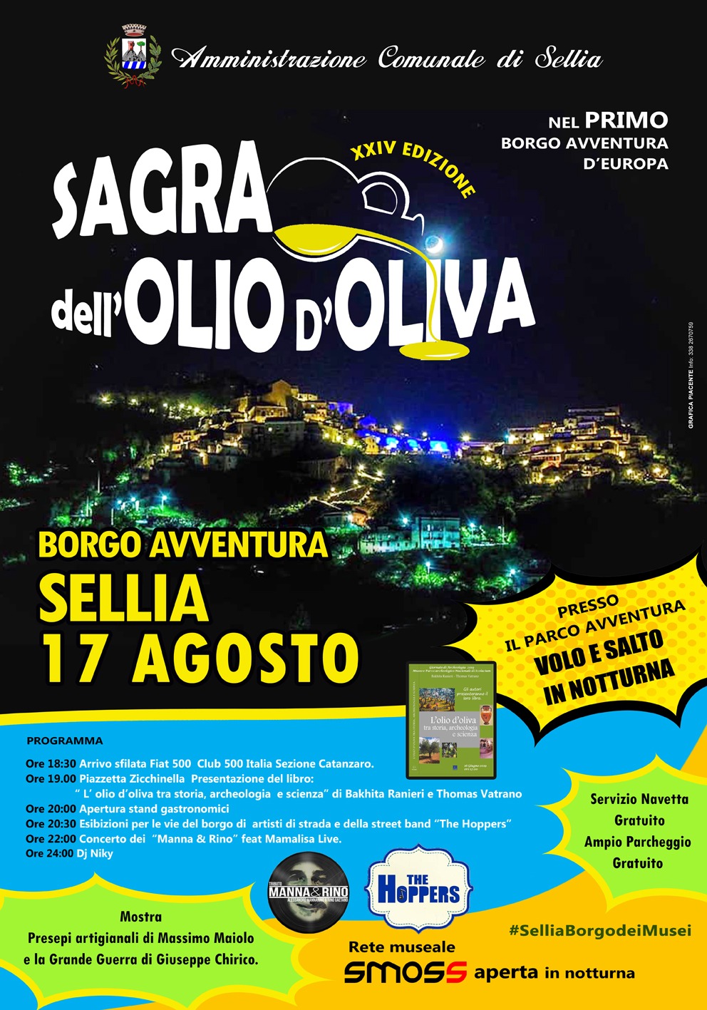 Si chiama “Sagra dell’olio d’oliva”, ma solo perché si tratta di un appuntamento consolidato nel tempo con questa definizione: quest’anno infatti si taglia il nastro della XXIV edizione. Ma Sellia, lo splendido borgo incastonato nei monti della Presila catanzarese, si apre pronto ad accogliere turisti, curiosi e appassionati da tutta la regione per quello che è un vero e proprio evento culturale. Sabato 17 agosto, infatti, rimarranno aperti tutti i musei della rete SMOSS anche in notturna, dove si svolgeranno dei laboratori creativi (in particolare nel museo dei Bambini e al Museo delle scienze), potrà essere visitata la mostra di Giuseppe Chirico dedicata alla Grande Guerra e dei Presepi artigianali realizzata da Massimo Maiolo. E ancora, dopo l’arrivo della sfilata della Sezione di Catanzaro del Club delle Fiat 500, previsto per le 18.30, in piazzetta Zicchinella alle 19 si terrà la presentazione del libro di Bakhita Ranieri e Thomas Vatrano “L’olio d’oliva tra storia, archeologia e scienza”. Di vero e proprio evento parla anche il sindaco, e consigliere provinciale, Davide Zicchinella alla sua decima sagra da organizzatore. “Siamo arrivati alla XXIV edizione, questo è un momento molto atteso per Sellia e per tutta l’area della Presila Catanzarese – afferma Zicchinella -. La cosa positiva è quest’anno siamo riusciti a realizzarla grazie a donazioni e sponsorizzazioni di privati. Un evento culturale, non solo enogastronomico, che organizziamo senza intaccare le risorse del Comune che infatti non spende un centesimo”.