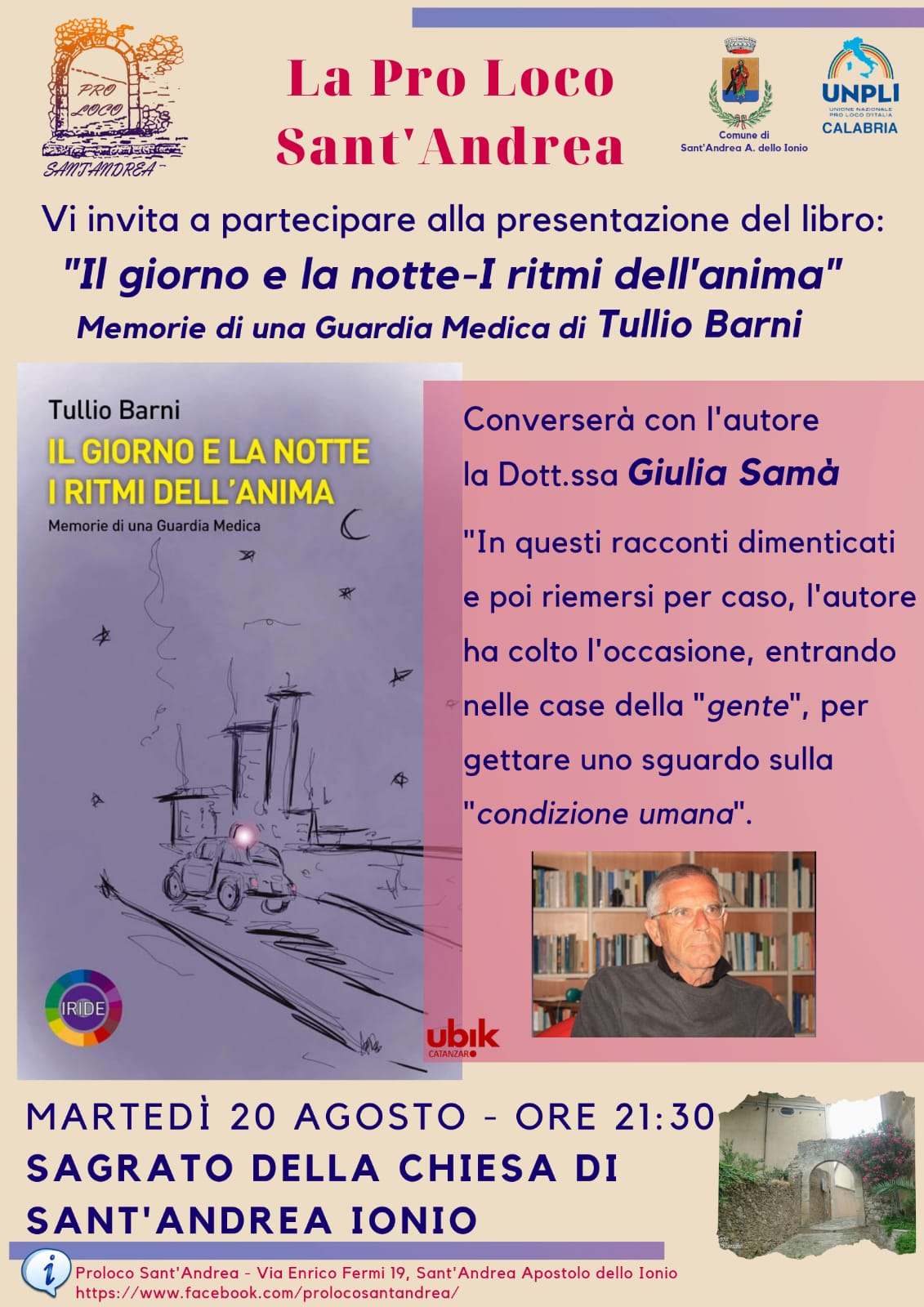 Stasera alle ore 21:30 presso il Sagrato della Chiesa di Sant'Andrea, a Sant’Andrea Apostolo dello Ionio, si terrà la presentazione del libro "Il giorno e la notte - i ritmi dell’anima, di Tullio Barni. Converserà con l'autore la dott.ssa Giulia Samà.