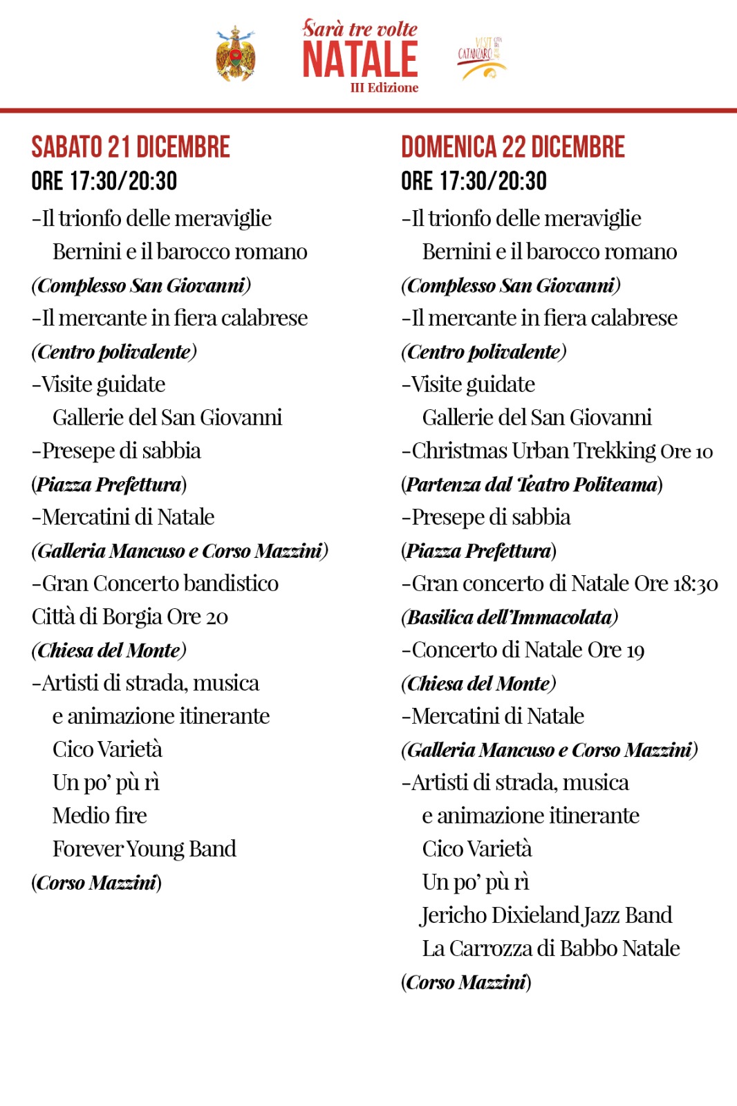 Un’altra ricca carrellata di manifestazioni accompagnerà i catanzaresi in questo fine settimana. Lo hanno annunciato il sindaco, Sergio Abramo, e gli assessori Ivan Cardamone, Alessandra Lobello e Alessio Sculco. “Sarà tre volte Natale ha già riscosso un successo notevole per apprezzamento e partecipazione in un’escalation di eventi che ci sta velocemente portando alle celebrazioni della Natività”, hanno sottolineato il primo cittadino e i delegati di giunta. “Spettacoli, arte, cultura, artigianato, anche fra domani e domenica non mancheranno appuntamenti per tutte le età e tutti i gusti nel cuore pulsante del capoluogo”.