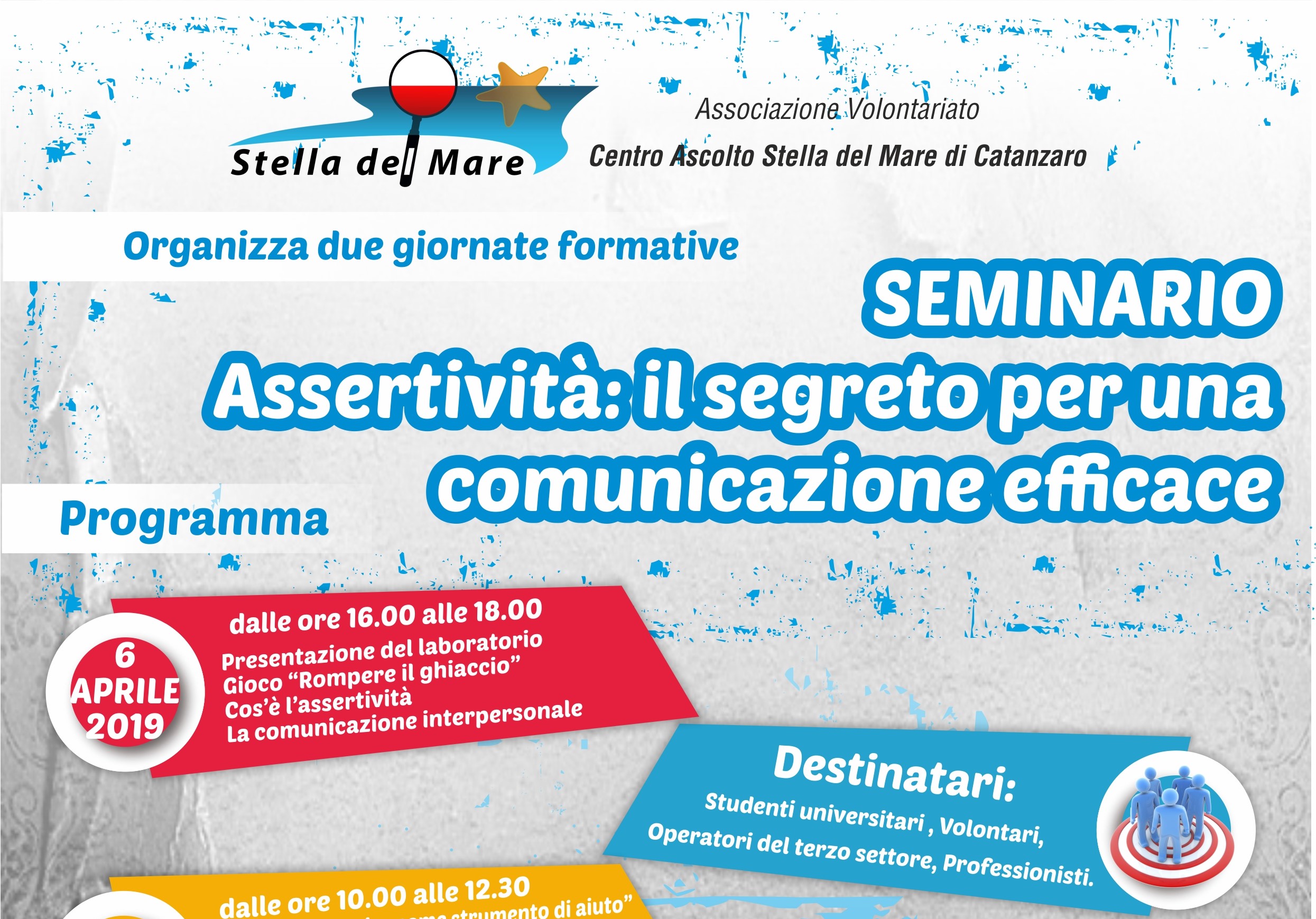 Il 6 e il 7 aprile 2019, presso la sede legale dell’associazione Stella del Mare sita in via Discesa Filanda, si svolgerà il seminario dal titolo: “Assertività: il segreto per una comunicazione efficace” con la finalità di acquisire e migliorare le capacità comunicative. All’evento, che si effettuerà al raggiungimento di 10 iscritti, destinato a studenti universitari, volontari, operatori del terzo settore e professionisti, interverranno la psicologa clinica, dottoressa Francesca Cuomo, e la criminologa forense, dottoressa Stefania Mandaliti.