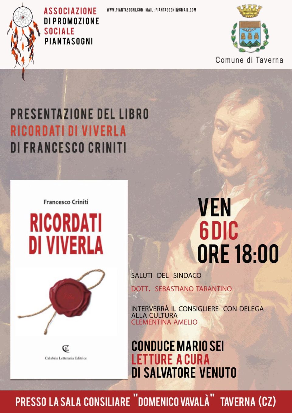 ‘Ricordati di viverla’, un inno alla vita racchiuso nel libro di Francesco Criniti che sarà presentato oggi pomeriggio, venerdì 6 dicembre, alle ore 18:00 presso la sala consiliare "Domenico Vavalà" di Taverna alla presenza del sindaco della cittadina di Mattia Preti, Sebastiano Tarantino, e della consigliera comunale delegata alla Cultura, Clementina Amelio. A condurre l’evento sarà Mario Sei mentre le letture di alcuni brani saranno a cura dell’attore del Teatro di Calabria, Salvatore Venuto.