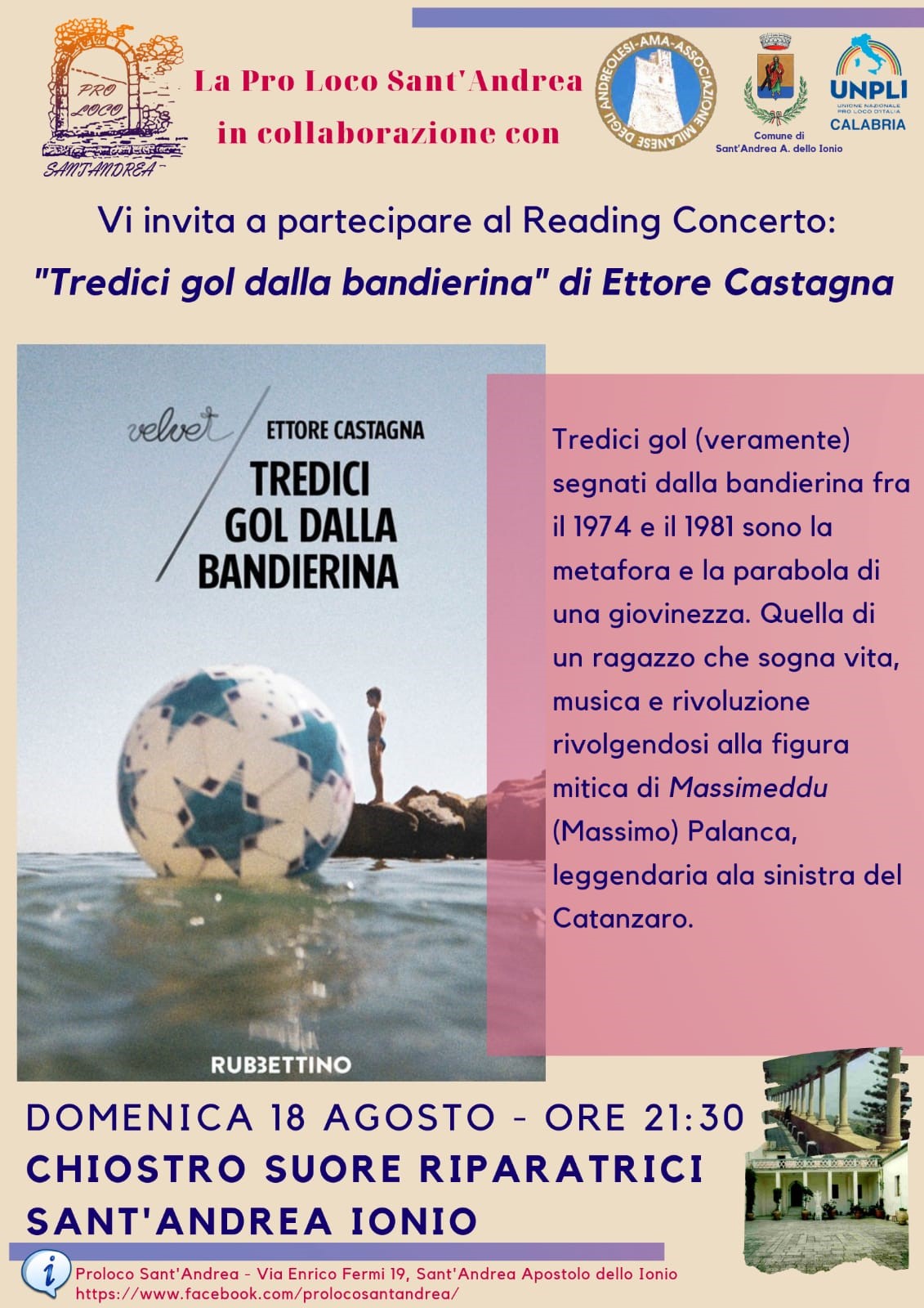 L'appuntamento, a cura della Pro Loco Sant’Andrea e dell’Associazione Milanese degli Andreolesi, è per domenica 18 agosto, alle ore 21.30, presso il Chiostro del Convento delle Suore Riparatrici di Sant’Andrea Apostolo dello Ionio, per quella che non sarà una mera presentazione, bensì un’occasione per riflettere e sorridere insieme, tra racconti di riscatto, intravisto da un calcio d'angolo o da un corteo femminista e originali rivisitazioni dei capolavori del cantautorato italiano.