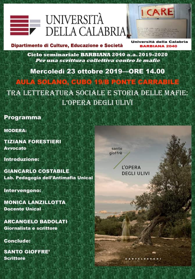 Si terrà mercoledì 23 ottobre alle 14 presso l’aula Solano, cubo 19/B, del Dipartimento di Culture, Educazione e Società la presentazione del romanzo storico-sociale di Santo Gioffrè, L’opera degli ulivi, nell’ambito delle attività didattiche del Laboratorio di Pedagogia dell’Antimafia dell’Università della Calabria. L’iniziativa sarà moderata dall’avvocato Tiziana Forestieri e introdotta da Giancarlo Costabile del Laboratorio di Antimafia, giunto al 9° anno di sperimentazione. Alla discussione interverranno Monica Lanzillotta, docente di Letteratura Italiana presso l’ateneo di Arcavacata, e Arcangelo Badolati, scrittore e capo della Redazione cosentina di Gazzetta del Sud. Il seminario che muoverà dalla categorie proprie della letteratura sociale e della storia delle mafie sarà concluso dall’autore del libro, lo scrittore reggino Santo Gioffrè.