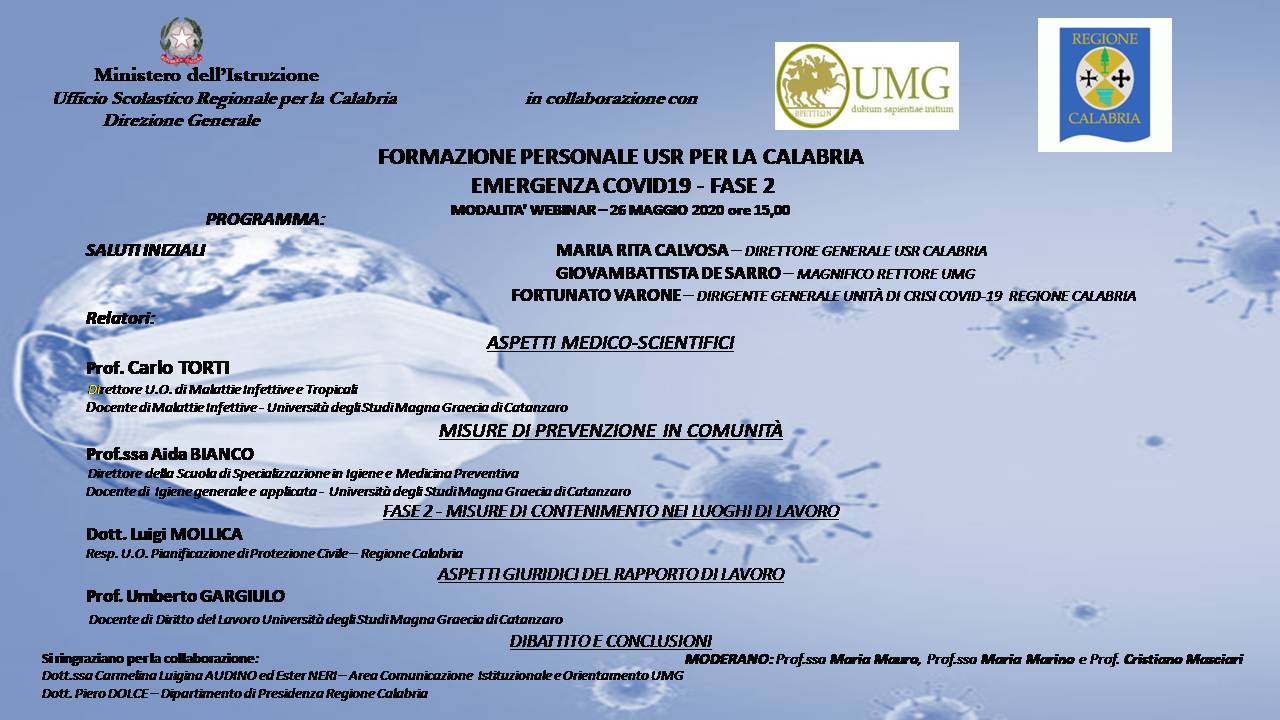 Grazie ad un accordo trilaterale tra USR, UMG di Catanzaro e il Dipartimento di Presidenza della Regione Calabria, si è potuta avviare una proficua collaborazione con l’Università “Magna Graecia” di Catanzaro, grazie al Magnifico Rettore Prof. Giovambattista De Sarro; ciò ha permesso che la formazione si potesse avvalere di altissimi professionisti, quali il Direttore dell’UO di Malattie Infettive e Tropicali, Prof. Carlo Torti, della Prof.ssa Aida Bianco, Direttore dell’U.O. di igiene e salute e del Prof. Umberto Gargiulo, docente di Diritto del Lavoro, presso l’UMG di Catanzaro. Per il Dipartimento di Presidenza della Regione Calabria, grazie al Dirigente Generale Fortunato Varone, è intervenuto il Dott. Luigi Maria Mollica, Responsabile dell’U.O. di programmazione della Protezione Civile.
