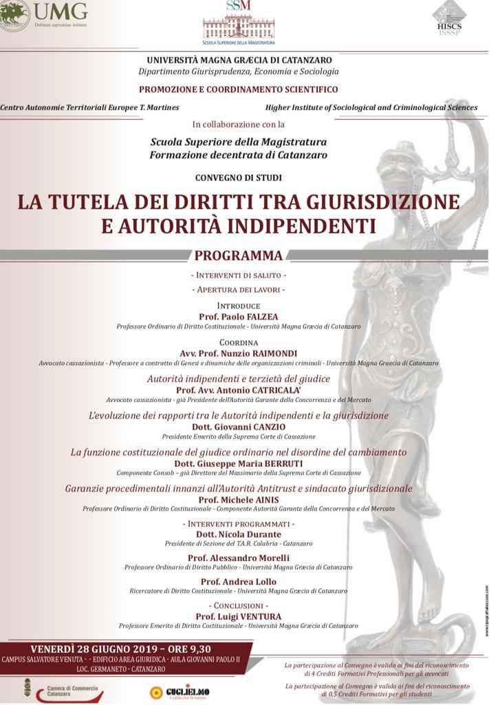 Si terrà venerdì 28 giugno, dalle ore 9.30, presso l’Università degli Studi “Magna Græcia” di Catanzaro, Campus “Salvatore Venuta”, Edificio Area Giuridica - Aula Giovanni Paolo II, un interessante convegno di studi dal titolo “La tutela di diritti tra giurisdizione e autorità indipendenti”.