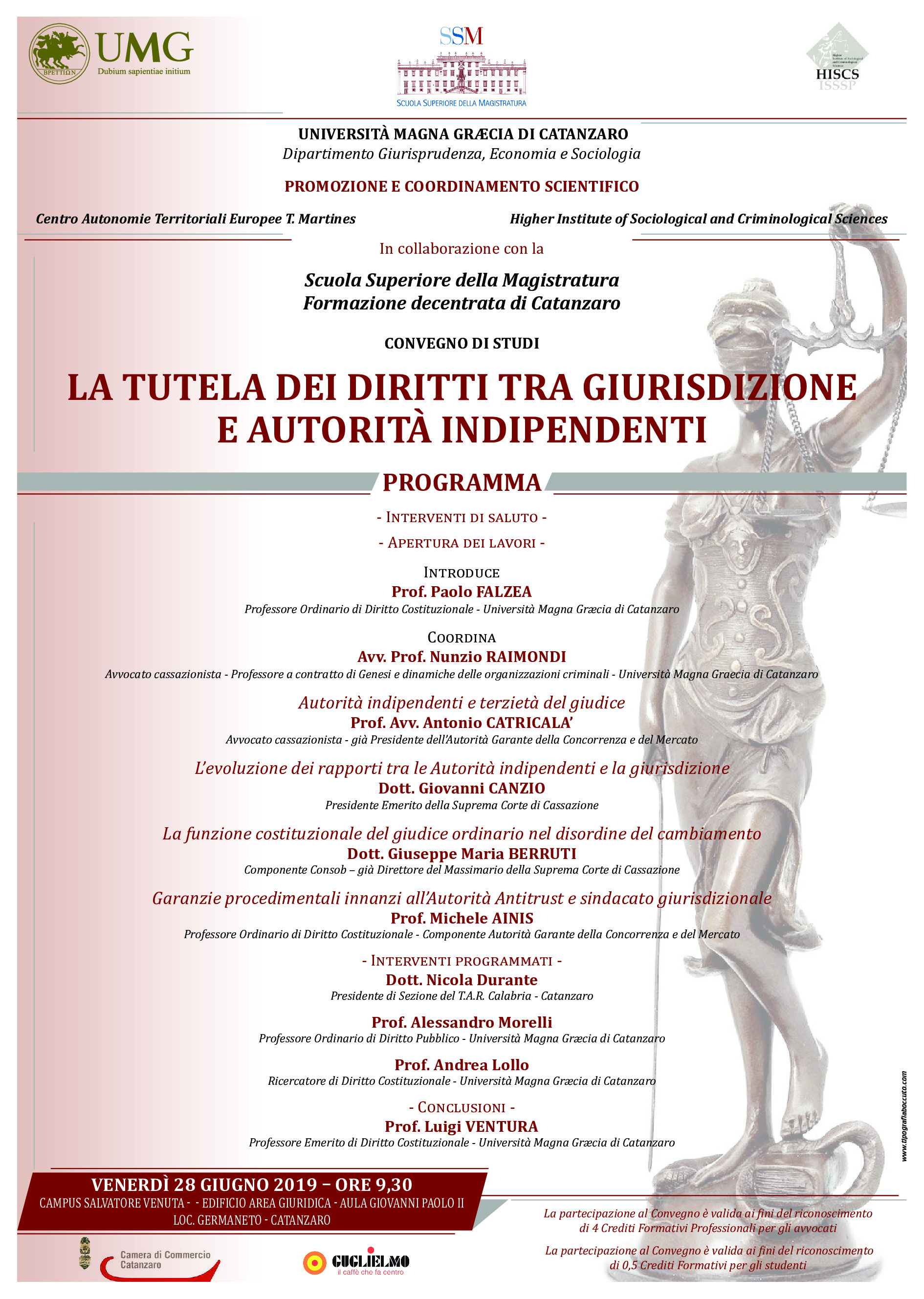 Si terrà venerdì 28 giugno, dalle ore 9.30, presso l’Università degli Studi “Magna Græcia” di Catanzaro, Campus “Salvatore Venuta”, Edificio Area Giuridica - Aula Giovanni Paolo II, un interessante convegno di studi dal titolo “La tutela di diritti tra giurisdizione e autorità indipendenti”.