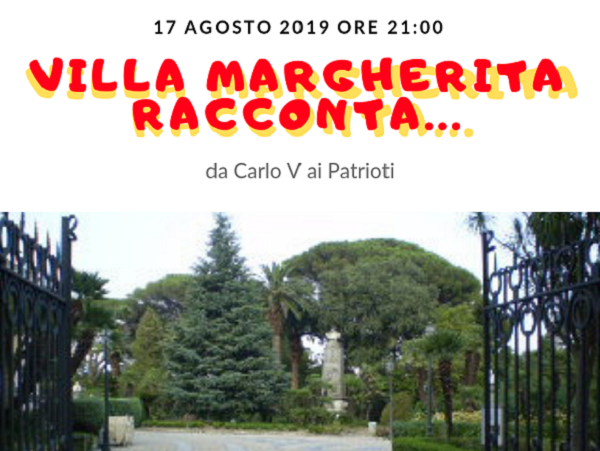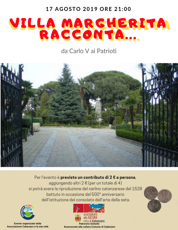 L’Associazione “Catanzaro è la mia città”, con il patrocinio gratuito dell’assessorato alla cultura del Comune di Catanzaro, organizza per il 17 agosto alle ore 21 l’evento “Villa Margherita Racconta…. da Carlo V ai patrioti“ .