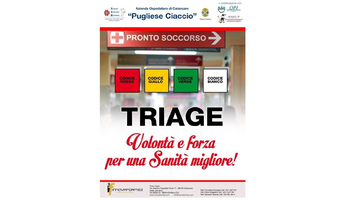 Lunedi 28 Ottobre alle ore 11.30 verrà presentato, nella sede della Direzione Generale Dell’Azienda Ospedaliera “ Pugliese- Ciaccio”, l’Attivita’ di TRIAGE PEDIATRICO iniziato il 28 Giugno 2019 DELIBERA N. 64/2019 del 31/01/2019 ) , alla presenza del Direttore Generale dell’Azienda Pugliese Ciaccio , Antonio Mantella, della Presidente dell’Ordine degli Infermieri , Concetta Genovese , e delle Infermiere Pediatriche che ,su base volontaria , dopo training formativo in ambito di urgenza pediatrica secondo le linee guida SIMEUP, tirocinio presso il Dipartimento Materno Infantile dell’AOPC , Corso sulla “sicurezza sul luogo di lavoro” presso l’AOPC con successiva autorizzazione da parte del loro Ordine Professionale OPI , hanno reso possibile la realizzazione di questo Progetto di fatto unico e primo in Calabria .