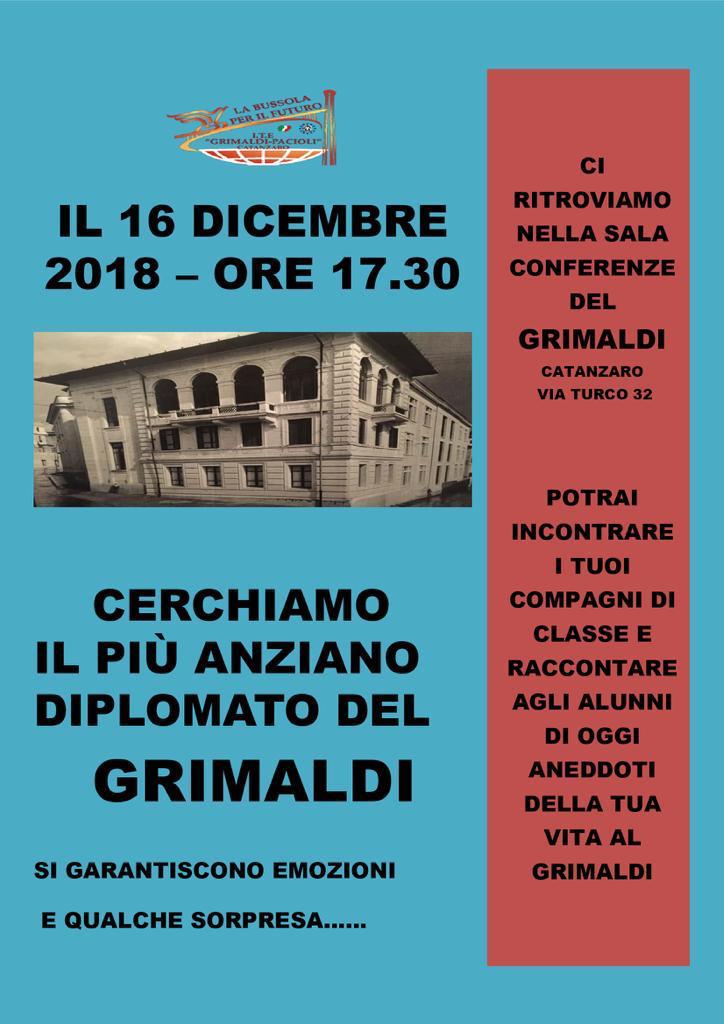L’istituto, inoltre, ha organizzato per domani, domenica 16 dicembre, a partire dalle ore 17:30, una vera e propria rimpatriata fra vecchi compagni di scuola. L’obiettivo è anche lo slogan dell’iniziativa:“Cerchiamo il più anziano diplomato del Grimaldi”. Sono previsti anche momenti di intrattenimento musicale. L’appuntamento, per tutti, è nel salone delle conferenze della sede di via Turco.