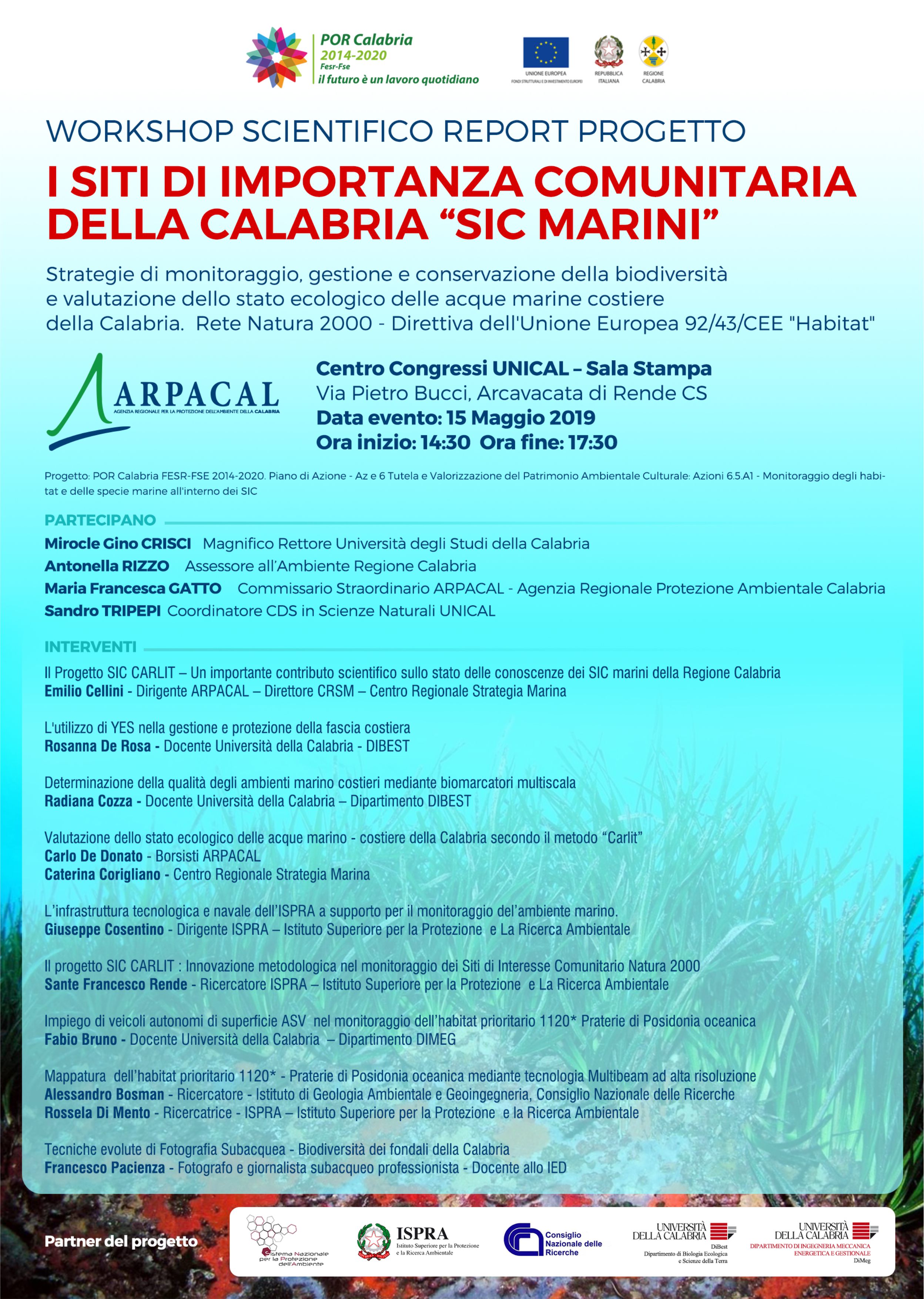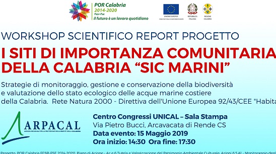 Mercoledì 15 Maggio 2019, a partire dalle ore 14:30 nel Centro Congressi dell’Unical ( Arcavacata di Rende – Cosenza ) si terrà il workshop scientifico di presentazione dei risultati intermedi del progetto “I SITI DI IMPORTANZA COMUNITARIA DELLA CALABRIA "SIC MARINI".