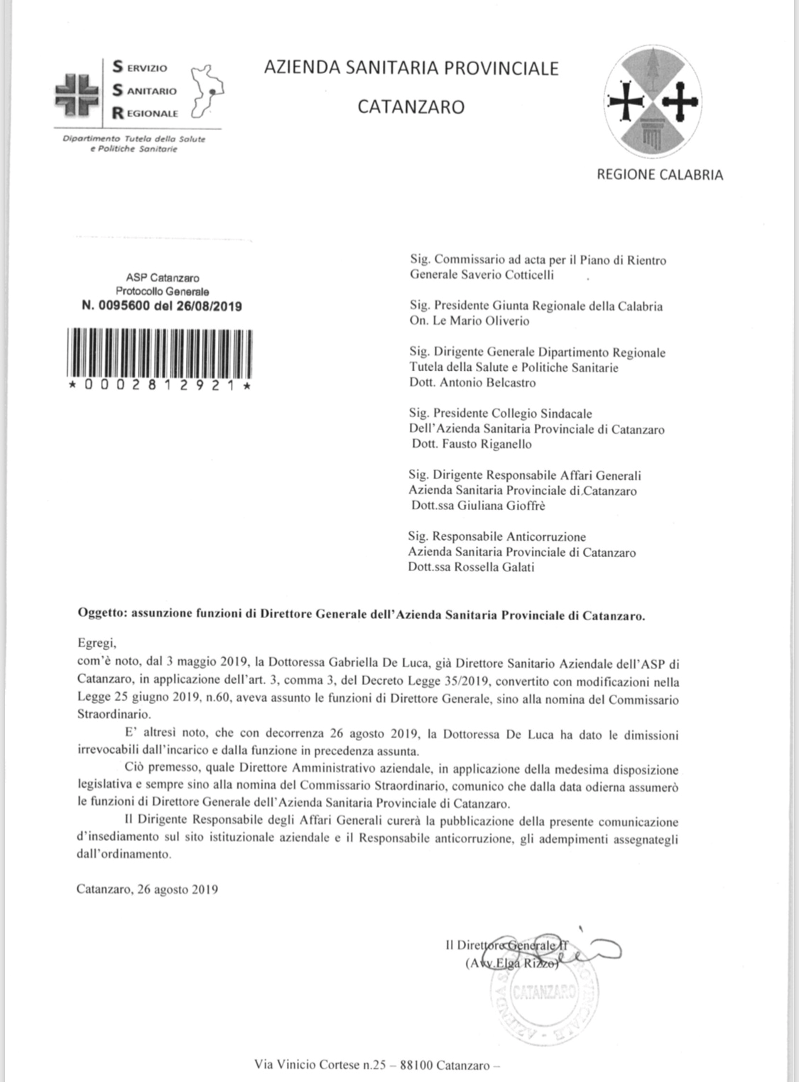 In pratica si è auto-nominata Direttore generale, comunicando ai vertici regionali “comunico che dalla data odierna assumerò le funzioni di direttore generale dell’azienda sanitaria provinciale di Catanzaro” ed invece di firmare come Direttore Amministrativo, forse per abituarsi, firma come Direttore Generale.