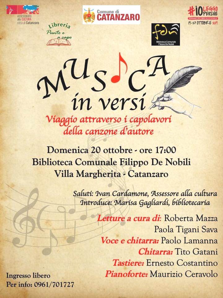 Nell’ambito della rassegna culturale “Ottobre in biblioteca”, organizzata dalla Biblioteca Comunale “Filippo De Nobili” e inserita nel programma di ioleggoperchè edizione 2019, domenica 20 ottobre, alle ore 17, sarà la volta di “Musica in Versi, viaggio attraverso i capolavori della canzone d’autore”. L’iniziativa, ad ingresso gratuito, è organizzata in collaborazione con la Libreria Punto e a capo di Catanzaro. Alla presenza dell’assessore alla cultura, Ivan Cardamone, e del personale della Biblioteca, coordinato da Marisa Gagliardi, sarà proposto un percorso alla scoperta di brani musicali di noti cantautori italiani, interpretati dal gruppo musicale Punto d’equilibrio, composto per l’occasione da Paolo Lamanna (voce e chitarra), Tito Gatani (chitarra), Ernesto Costantino (tastiera) e Maurizio Ceravolo (pianoforte). L’attrice Roberta Mazza interpreterà alcuni testi di canzoni d’autore attraverso la lettura a voce alta. Lo spettacolo sarà presentato da Paola Tigani Sava, autrice delle parti introduttive ai brani stessi. “Obiettivo dell’incontro – sottolineano gli organizzatori - sarà quello di mettere in risalto il valore culturale sia della poesia che della musica e sottolineare l’armonioso legame che ne permette una reciproca esaltazione”.