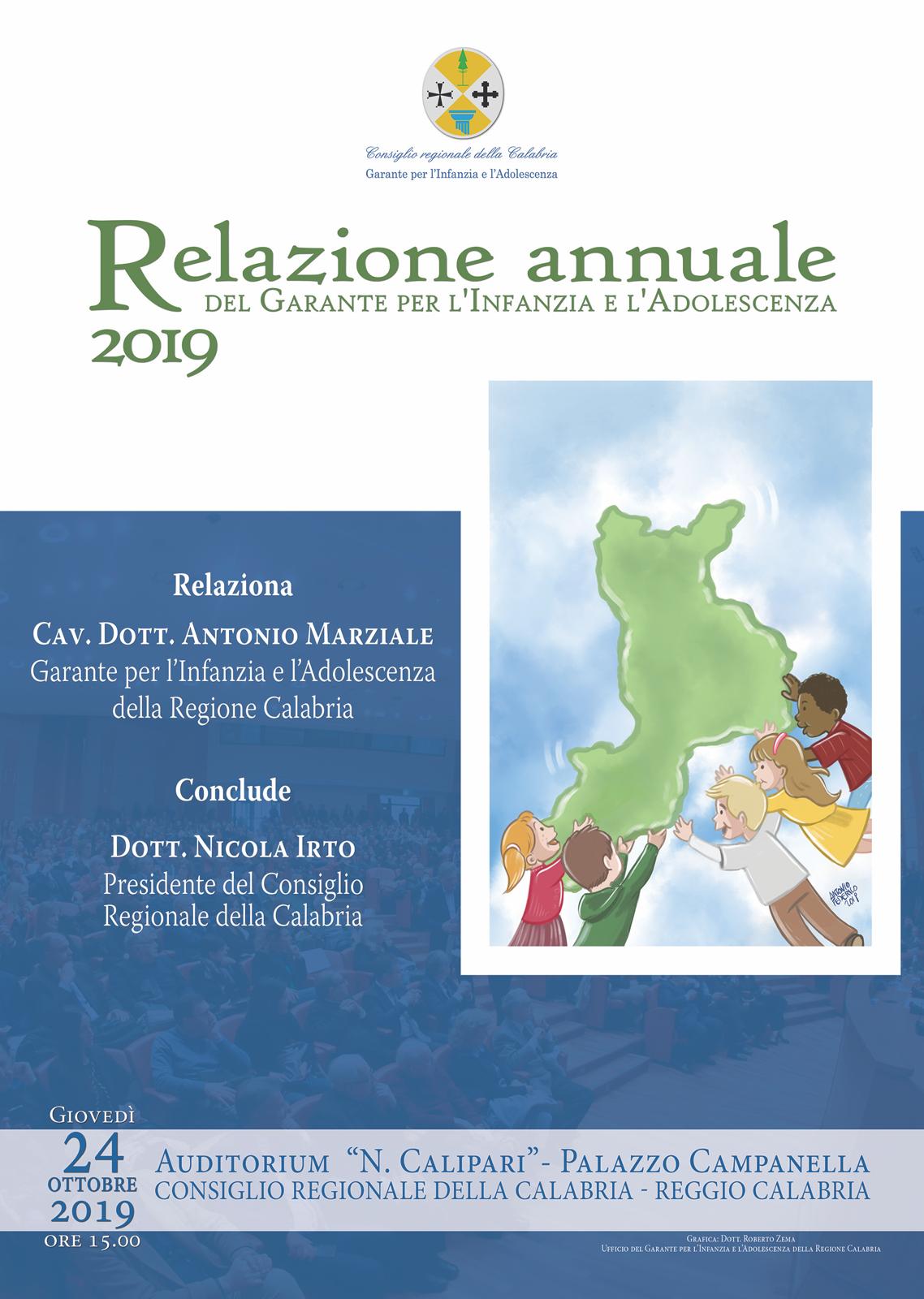 Sarà presentata domani, 24 ottobre, alle ore 15:00 nell’Auditorium “Nicola Calipari” di Palazzo Campanella, in via Cardinale Portanova a Reggio Calabria, la Relazione 2019 e di fine mandato del Garante per l’Infanzia e l’Adolescenza della Regione Calabria, Antonio Marziale. Alla manifestazione parteciperà il Presidente del Consiglio regionale, Nicola Irto.