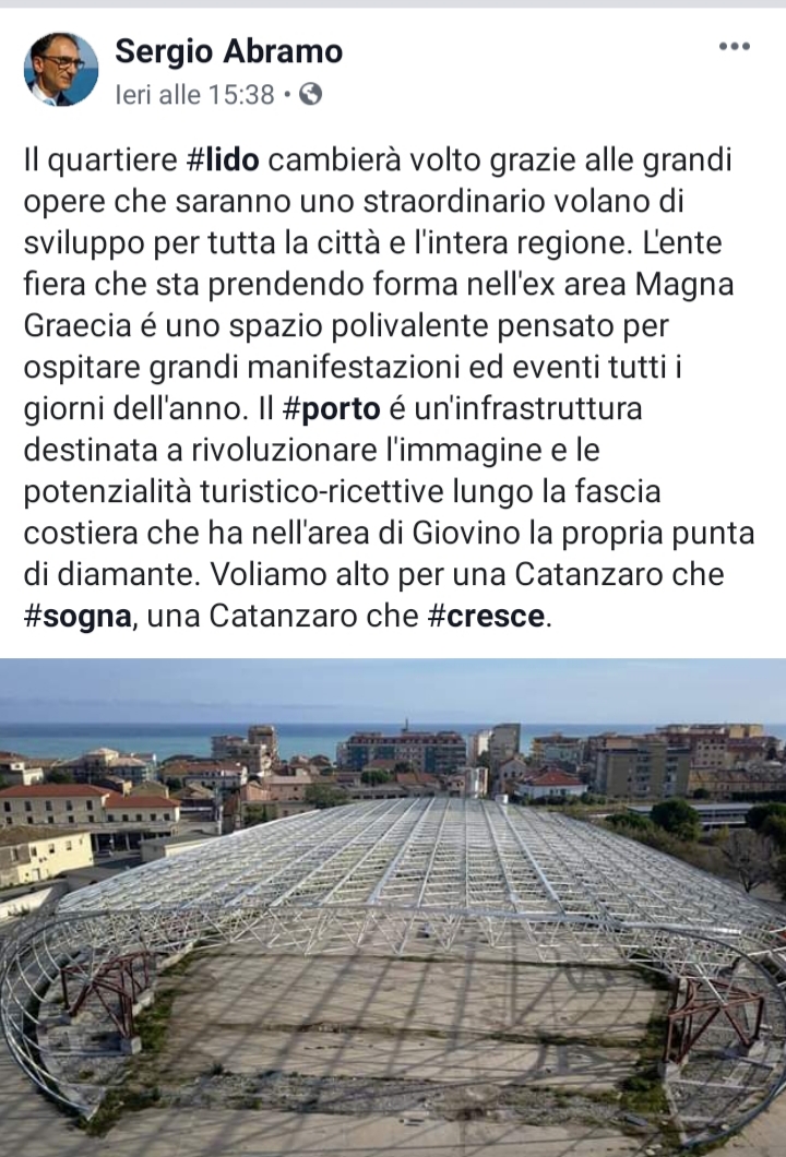 Prendendo atto delle buone intenzioni del sindaco Abramo espresse in un post sui social dove sostiene che “le grandi opere cambieranno il quartiere Lido e saranno uno straordinario volano di sviluppo per tutta la città”, corre l’obbligo di rammentare al primo cittadino alcuni dati oggettivi che, di fatto, contrastano con il suo entusiasmo.