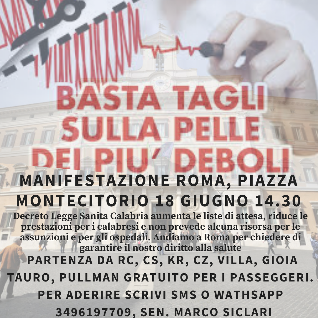 Tolto Scura, arriva il nuovo commissario senza strumenti di Governo e senza risorse. Martedì saremo in piazza Monte Citorio e rappresenteremo la parte sana della Calabria, quella che da decenni opera nel settore sanitario nel nostro territorio con rettitudine e professionalità ed è apprezzata anche fuori Calabria . Saremo in piazza perché conosciamo realmente i pericoli di questa emergenza sanitaria che non permette oggi ai cittadini calabresi di accedere alle cure e che peggiorerà con questa decreto da giorno 20 giugno. Non ci sarà alcuna assunzione all’ospedale di RC ne nelle altre strutture perché non è previsto alcun aumento dei fondi destinati all’assistenza sanitaria calabrese. Contattare il numero 349 6197709 per aderire alla manifestazione. Il pullman è gratis per manifestare per il nostro fondamentale diritto!».