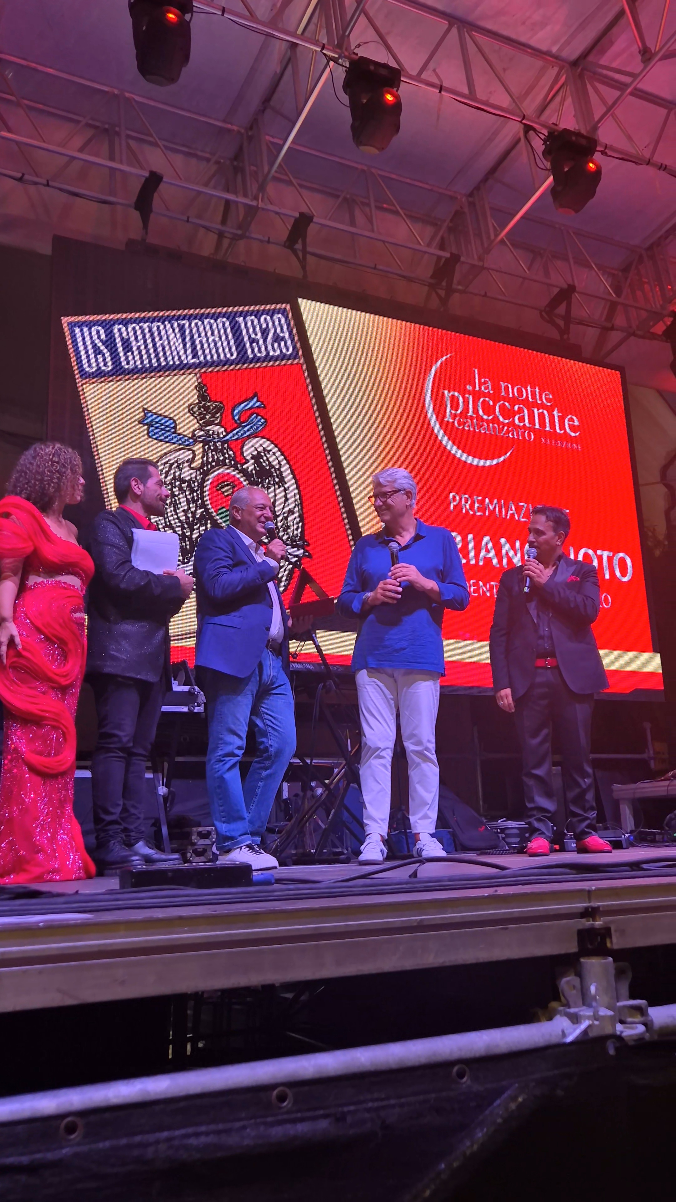 Un grande ed appassionato applauso, nella piazza principale de La Notte Piccante di Catanzaro, ha accolto l’ingegner Floriano Noto salito sul palco per ricevere l’ambito riconoscimento della più importante e ormai tradizionale manifestazione popolare del capoluogo. La targa de La Notte Piccante è stata consegnata al presidente dell’Us Catanzaro 1929 dal direttore artistico Roberto Talarico, peraltro noto instancabile tifoso dei colori giallorossi. La motivazione è stata chiara e pregna di significato: “All’ing. Floriano Noto per aver riportato il Catanzaro ai vertici del calcio nazionale”. I cori di entusiasmo hanno suggellato un momento di grande orgoglio giallorosso, riconoscendo i meriti oggettivi di un presidente che ha saputo, assieme ai propri fratelli Desiderio e Luigi, ricollocare l’Us Catanzaro nel giusto alveo disegnato dalla storia. I successi sportivi sono andati di pari passo con la costruzione di una società solida, efficiente, autorevole e come tale riconosciuta nel mondo certo non facile del calcio professionistico. Il popolo de La Notte Piccante, che ha inondato il centro storico della Città dei Tre Colli per vivere momenti di sano relax accompagnati da degustazioni di prodotti tipici e da tanta musica, al momento della consegna della targa ha gioito coralmente testimoniando ancora una volta il fortissimo attaccamento che la città intera ha per i propri colori.